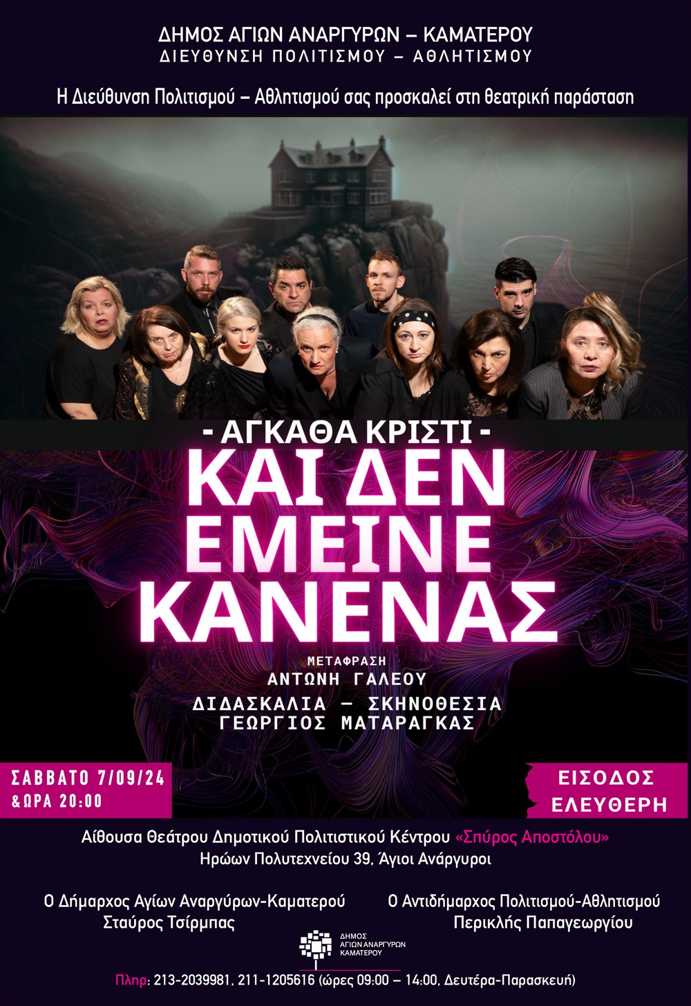 Σας περιμένουμε στην θεατρική παράσταση, βασισμένη στο μυθιστόρημα της Αγκάθα Κρίστι με τίτλο: «Και δεν έμεινε κανείς» στο Πολιτιστικό Κέντρο «Σπύρος Αποστόλου» που θα πραγματοποιηθεί το Σάββατο 7 Σεπτεμβρίου 2024 και ώρα 20.00 μ.μ.