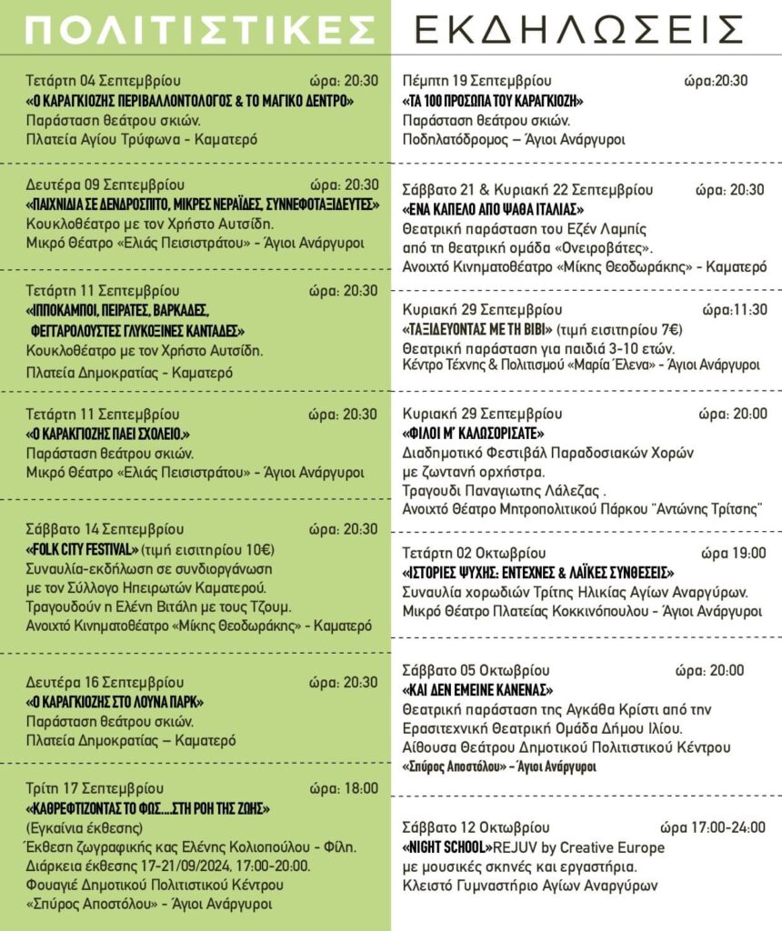 Το πρόγραμμα των πολιτιστικών εκδηλώσεων του Δήμου Αγίων Αναργύρων – Καματερού για τον μήνα Σεπτέμβριο.